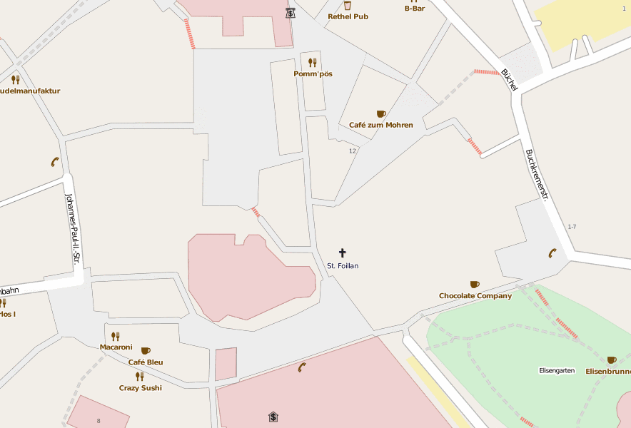 In der Umgebung finden Sie beliebte Sehenswürdigkeiten wie etwa Puppenbrunnen, St. Foillan sowie Aachener Dom. Häufig betrachtet sind darüber hinaus folgende Karten: Elisenbrunnen, RWTH Aachen, Suermondt-Ludwig-Museum und Couven-Museum